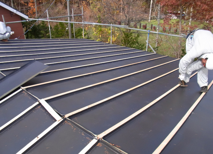 既存カラーベスト屋根の上に、カバー工法でガルバリウム鋼板横葺屋根を施工しました。